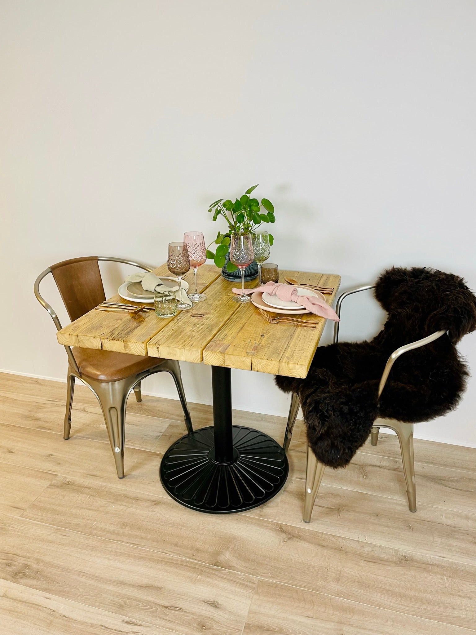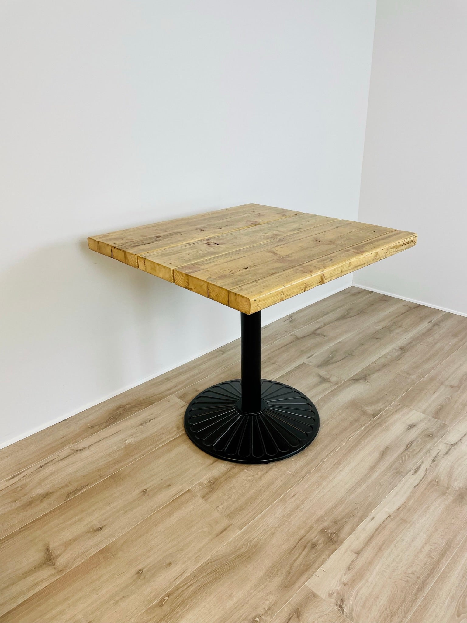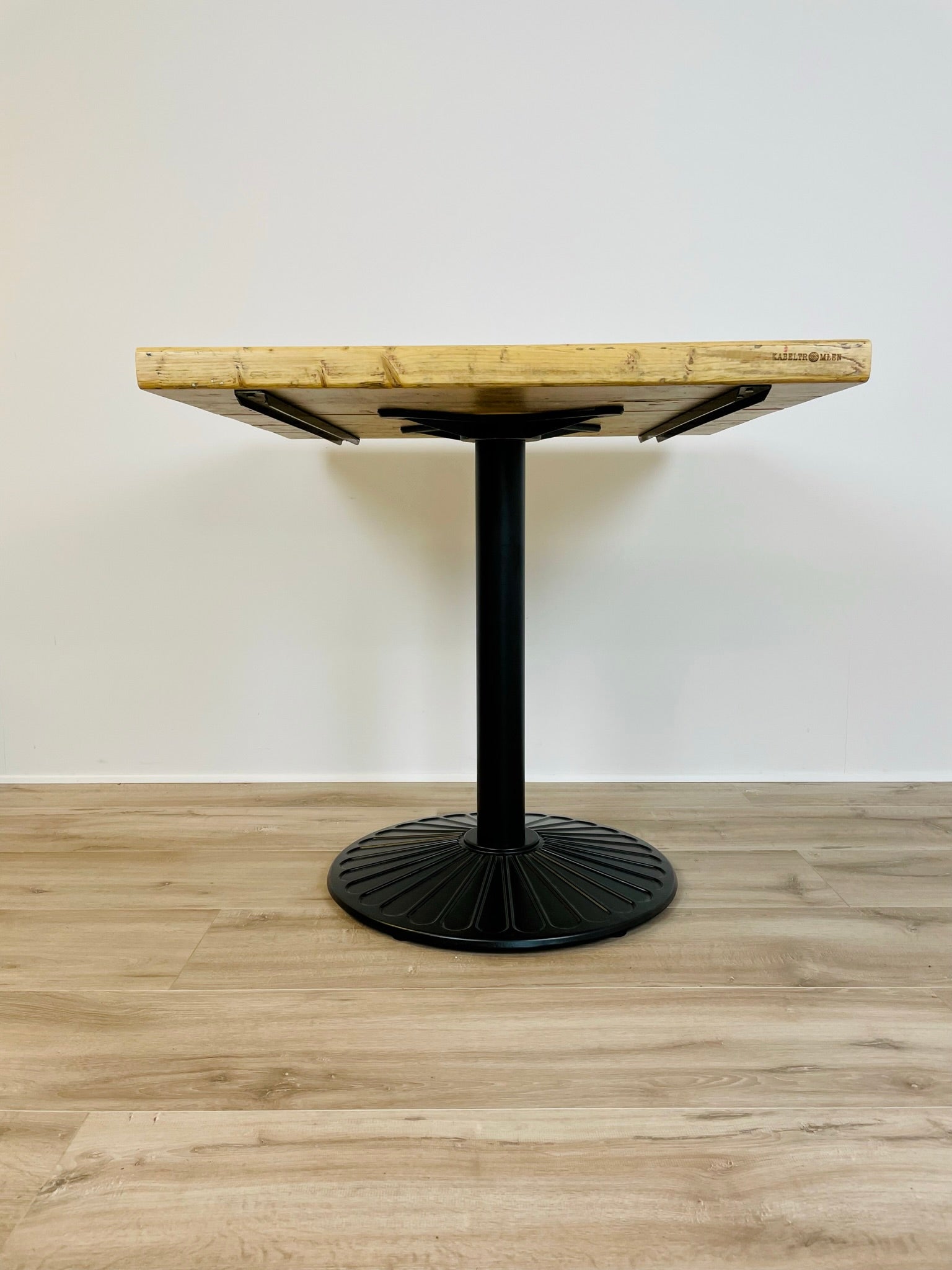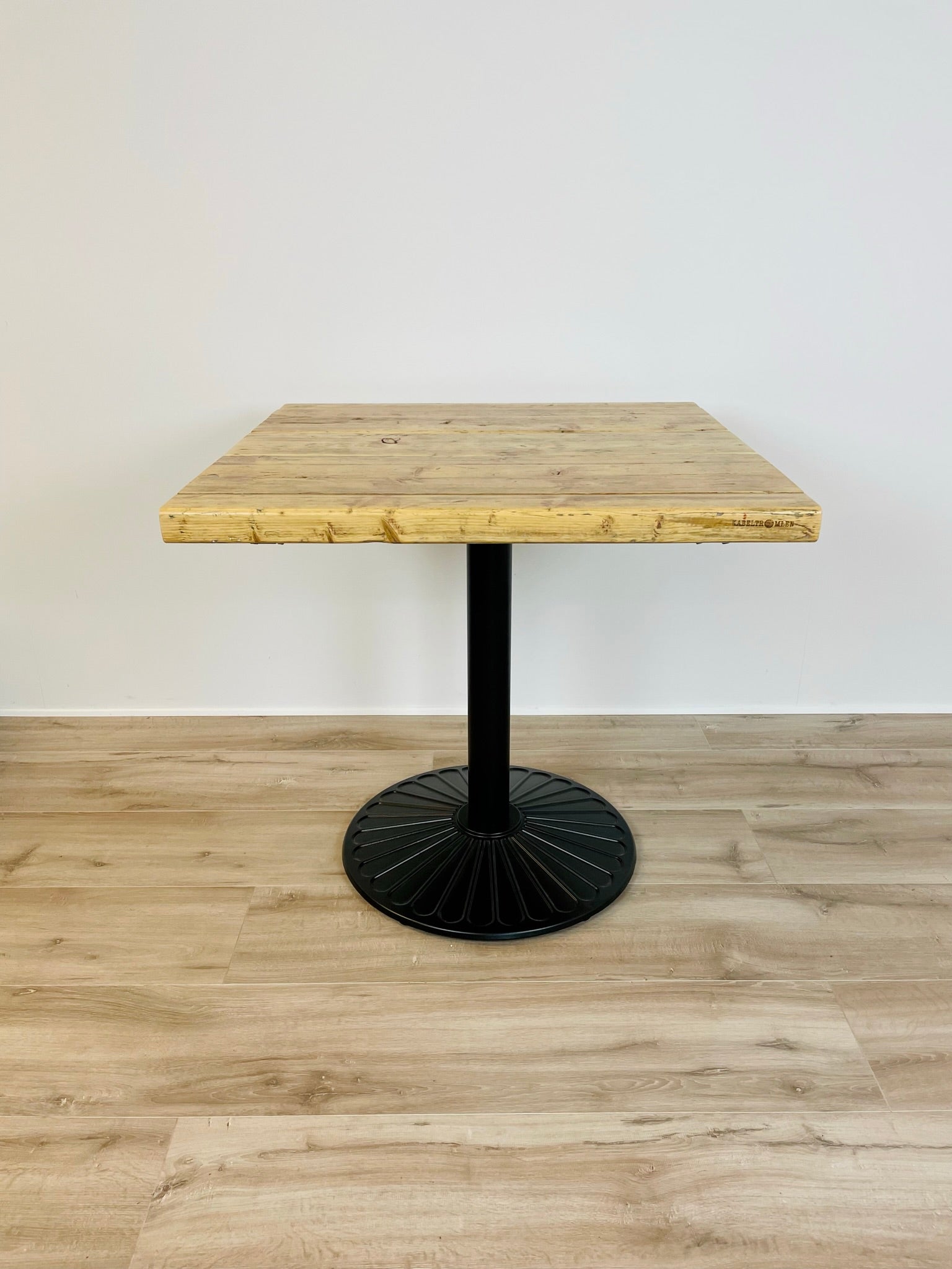Kabeltromlens cafébord af genbrugstræ er lavet af upcyclede stilladsplanker, hvilket gør hvert bord unikt med personlige aftryk og spor fra træets tidligere liv i industrien.